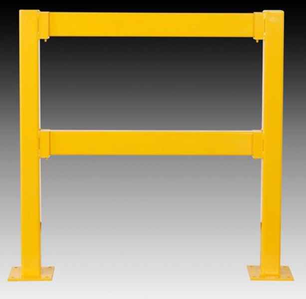 80mm square corner up-rights come in single, double or three way as standard, mounted upon a pre-drilled footplate. (Floor fixings not supplied). 100mm x 50mm lift out rails can span upto 3 metres in one go, with an in-line upright for greater distances. Standard access rail heights are 500mm and 1100mm, but any height can be tailored to suit your requirements.